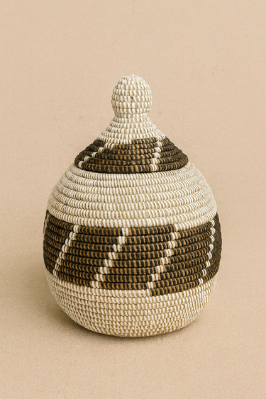 Handwoven in Senegal using centuries-old coiling techniques, the Lomé Basket brings both artistry and function to your space. Crafted from locally sourced grasses and wrapped in recycled plastic threads, each piece showcases a bold Noir-and-Sand geometric pattern unique to its maker.