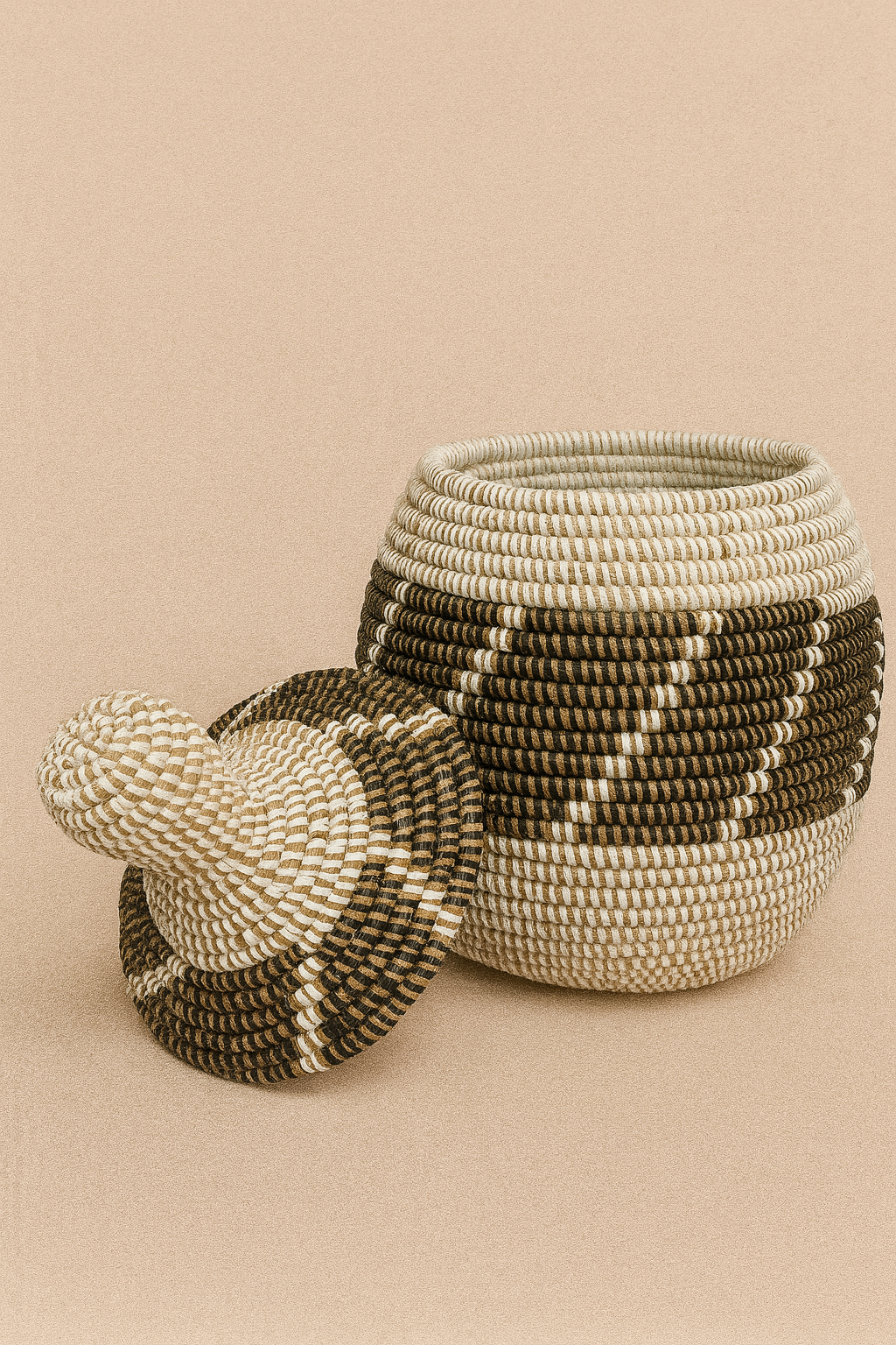 Perfect for storing everyday essentials or displaying as a sculptural accent, this lidded basket carries the warmth, rhythm, and heritage of West African craftsmanship.