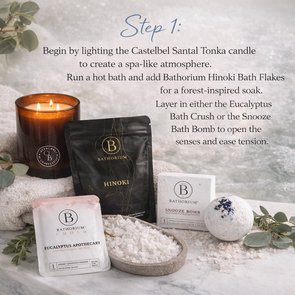 Begin by lighting the Castelbel Santal Tonka candle to create a spa-like atmosphere. Run a hot bath and add Bathorium Hinoki Bath Flakes for a forest-inspired soak. Layer in either the Eucalyptus Bath Crush or the Snooze Bath Bomb to open the senses and ease tension.