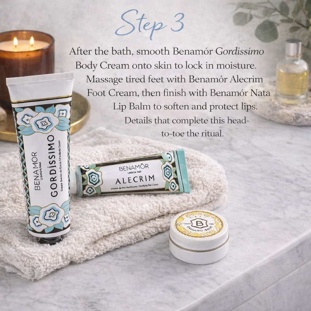 After the bath, smooth Benamôr Gordissimo Body Cream onto skin to lock in moisture. Massage tired feet with Benamôr Alecrim Foot Cream, then finish with Benamôr Nata Lip Balm to soften and protect lips. Details that complete this head-to-toe the ritual.