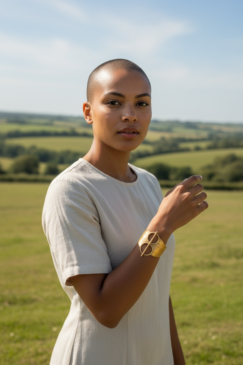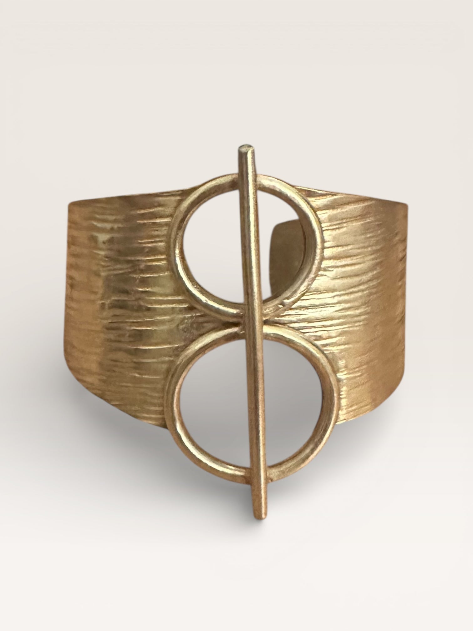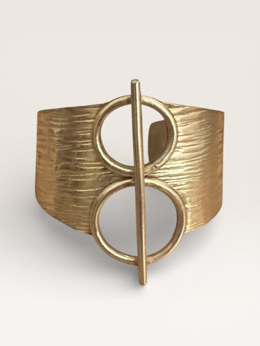 A striking study in balance and form, the Axis Cuff features a wide, softly textured brass band anchored by two open circular elements intersected by a vertical bar. The geometric composition feels both modern and symbolic -- axisan expression of alignment, grounding, and quiet strength. Designed to sit confidently on the wrist, this piece makes a bold statement while remaining effortlessly wearable.