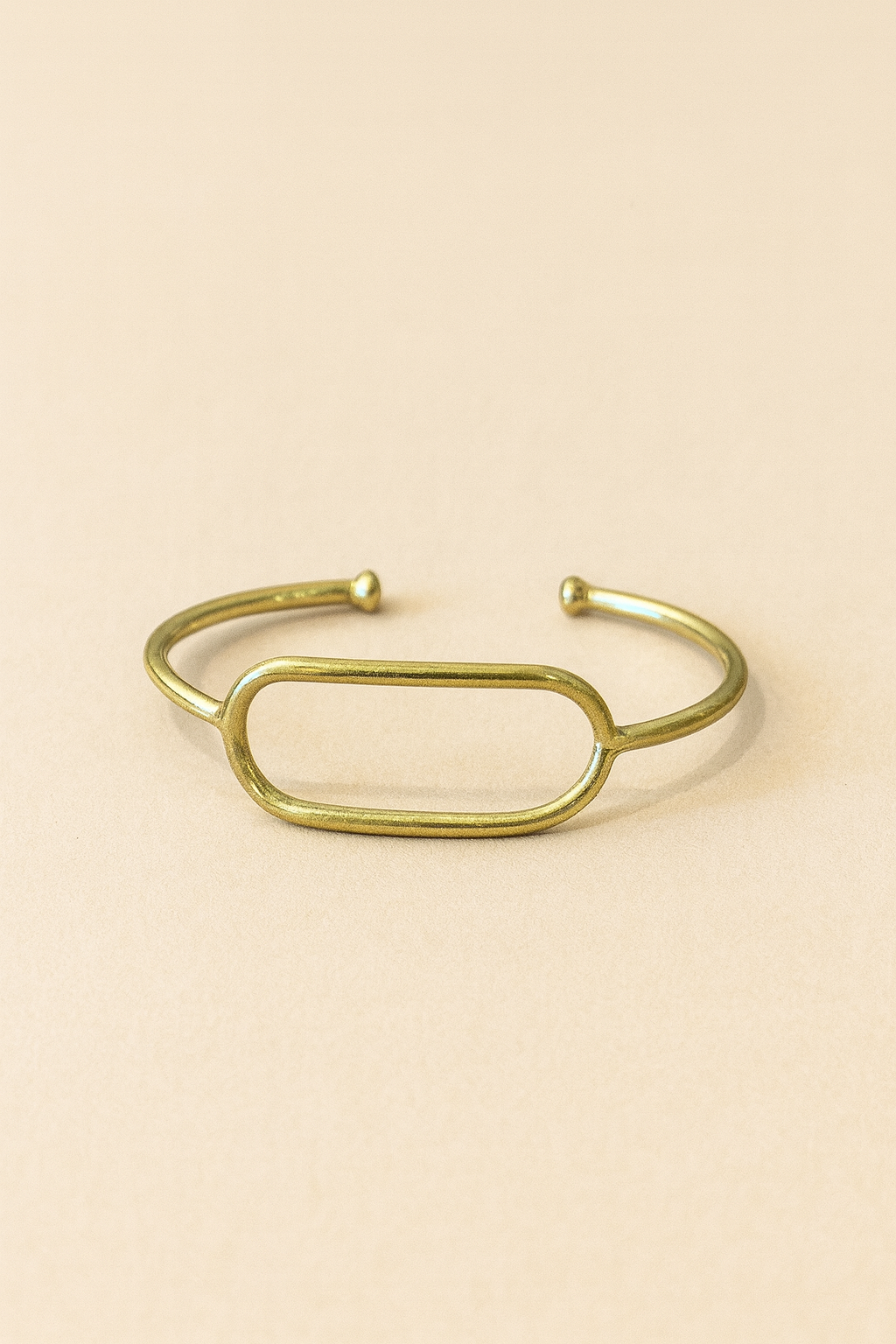 Sleek, modern, and effortlessly versatile, the Minimalist Brass Oval Cuff brings timeless design to everyday wear. Handcrafted by West African artisans, this open-frame silhouette offers a lightweight feel with a bold geometric presence. Its smooth oval centerpiece creates a clean, architectural look -- perfect for stacking or wearing as a standalone statement.