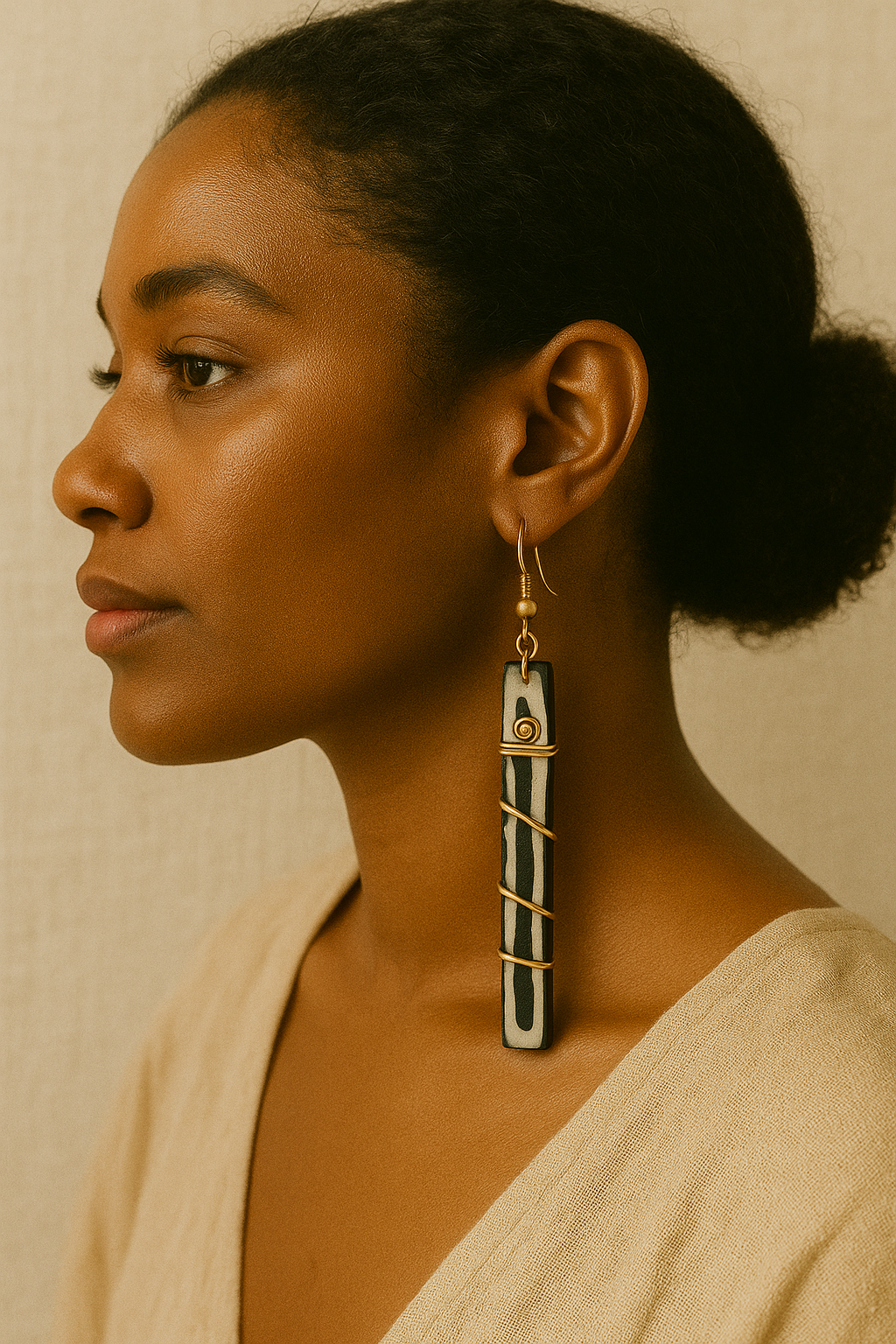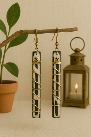 Handcrafted in the heart of Dakar’s bustling Medina market, these earrings tell a story in form and texture. Each piece begins with hand-carved bone, naturally patterned and unique to its origin. The artisan then wraps each piece in spiraled brass wire, creating a striking linear silhouette that feels both grounded and sculptural.