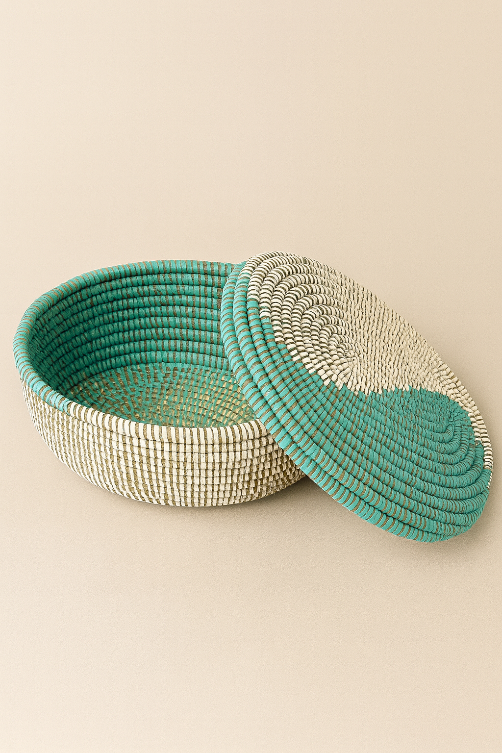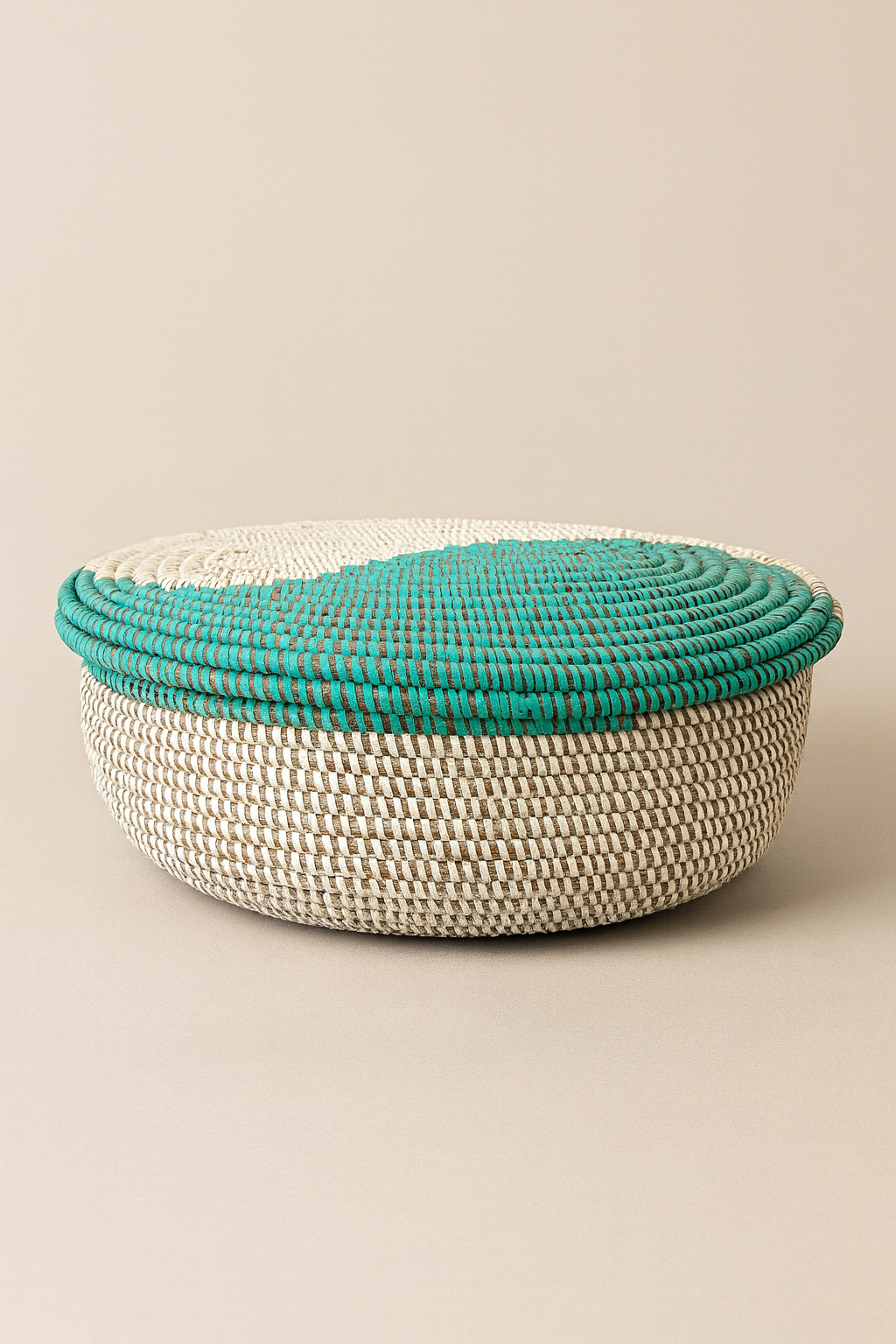 Inspired by Senegal’s sun-washed coastline, the Saly Basket brings a modern pop of color to a traditional West African form. Handwoven by artisans using coiled grasses and recycled plastic threads, this low-profile basket features a striking swirl of turquoise and natural tones -- an effortless blend of coastal calm and cultural craftsmanship.
